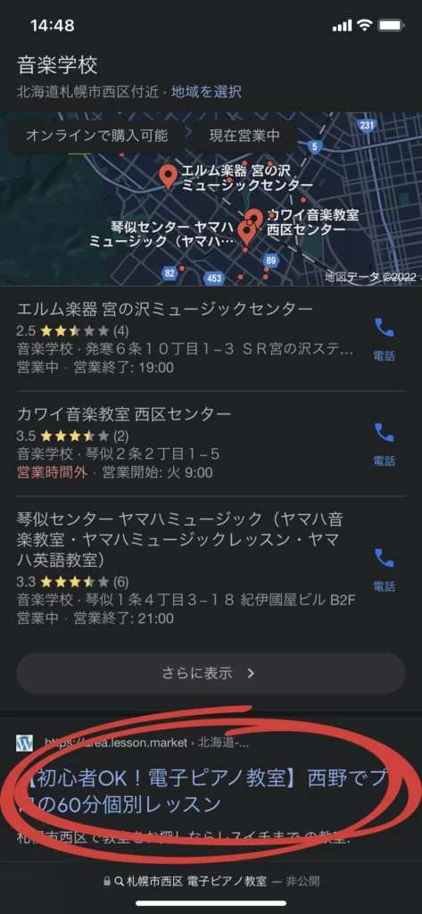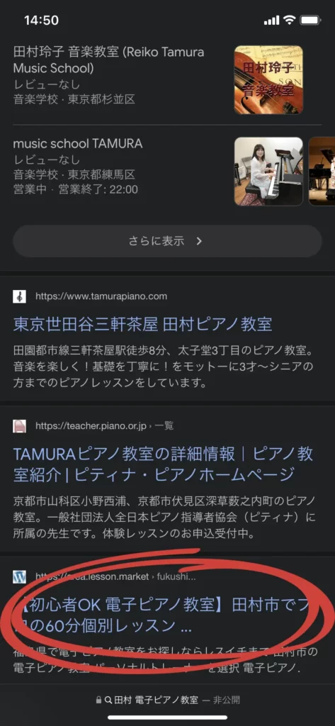 「電子ピアノ講師登録しただけで本当に申し込みが入るの?」そんな疑問をお持ちのあなたに私たちの集客実績の一部をお見せします。下記の検索ワードで上位表示されたページにあなたのプロフィールが掲載されていたらどうでしょうか?集客できるイメージができるかと思います。※実際に登録していただく”レスイチ”というサービスの検索結果を掲載しています。また、検索時期により順位が変動している可能性があります。