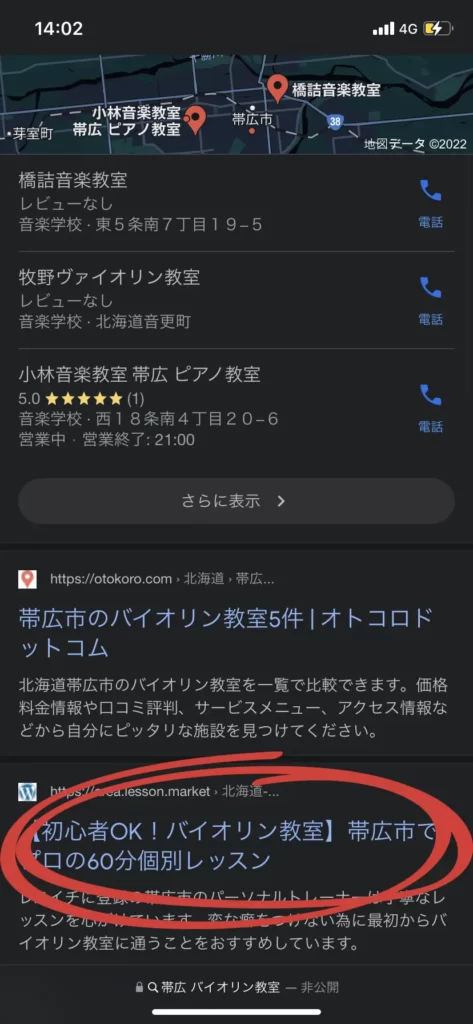 「バイオリン講師登録しただけで本当に申し込みが入るの?」そんな疑問をお持ちのあなたに私たちの集客実績の一部をお見せします。下記の検索ワードで上位表示されたページにあなたのプロフィールが掲載されていたらどうでしょうか?集客できるイメージができるかと思います。※実際に登録していただく”レスイチ”というサービスの検索結果を掲載しています。また、検索時期により順位が変動している可能性があります。