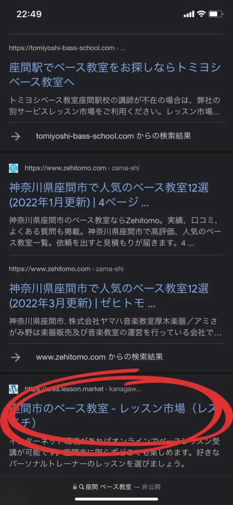 「ベース講師登録しただけで本当に申し込みが入るの?」そんな疑問をお持ちのあなたに私たちの集客実績の一部をお見せします。下記の検索ワードで上位表示されたページにあなたのプロフィールが掲載されていたらどうでしょうか?集客できるイメージができるかと思います。※実際に登録していただく”レスイチ”というサービスの検索結果を掲載しています。また、検索時期により順位が変動している可能性があります。