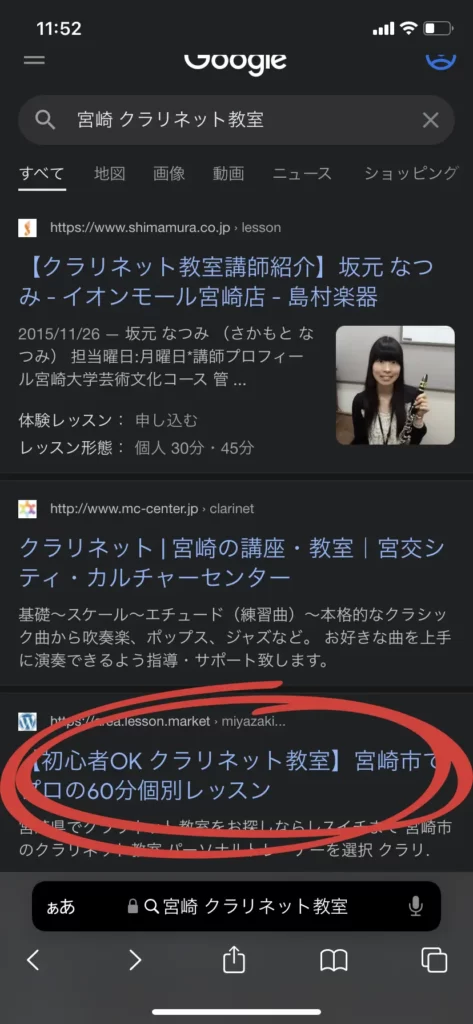 「クラリネット講師登録しただけで本当に申し込みが入るの?」そんな疑問をお持ちのあなたに私たちの集客実績の一部をお見せします。下記の検索ワードで上位表示されたページにあなたのプロフィールが掲載されていたらどうでしょうか?集客できるイメージができるかと思います。※実際に登録していただく”レスイチ”というサービスの検索結果を掲載しています。また、検索時期により順位が変動している可能性があります。